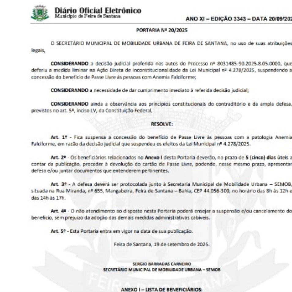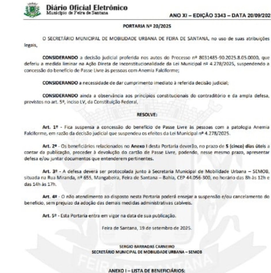 Um erro grave cometido pela Prefeitura de Feira de Santana, no centro-norte da Bahia, resultou na exposição indevida de dados sensíveis de centenas de cidadãos. No último sábado (20), o Diário Oficial do Município trouxe, em anexo a uma portaria, os nomes completos e números de cartão de mais de 200 pessoas diagnosticadas com fibromialgia, HIV e anemia falciforme.