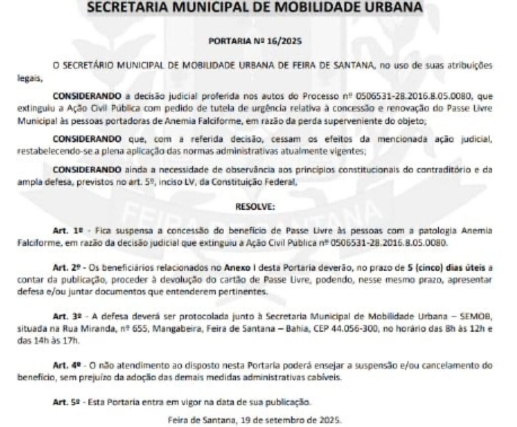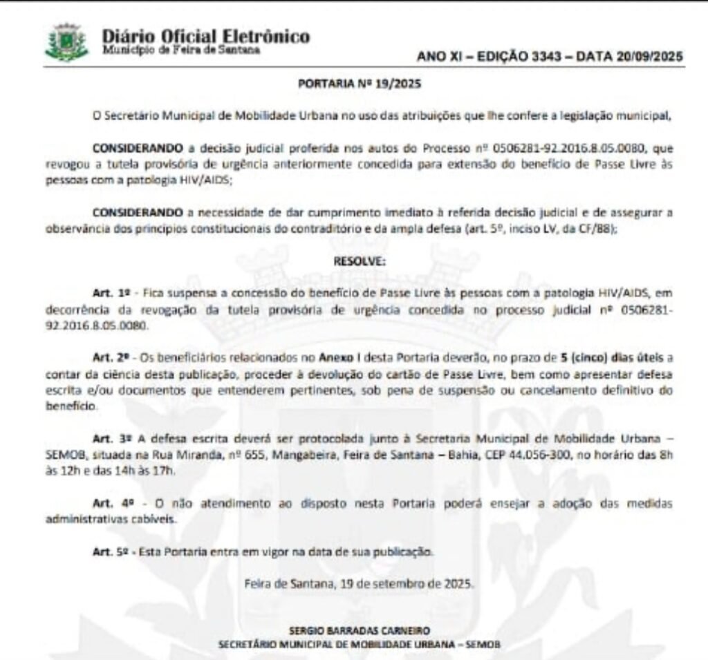 O documento estava relacionado à suspensão do benefício do Passe Livre, determinada por decisão judicial. Pela portaria, os pacientes listados devem devolver os cartões no prazo de cinco dias úteis, mas ainda têm o direito de apresentar defesa por escrito ou documentos que comprovem a necessidade da continuidade do benefício. Essa defesa deve ser protocolada presencialmente na Secretaria Municipal de Mobilidade Urbana (Semob), situada na Rua Miranda, nº 655, bairro Mangabeira, das 8h às 12h e das 13h às 17h.